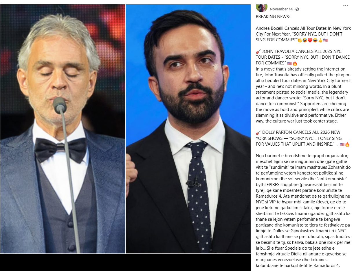 Në rrjete sociale, përfshi ato shqipfolëse, po qarkullon pretendimi se tenori italian Andrea Bocelli, ndër artistë e personazhe të tjerë të njohur, ka anulluar koncertet e tij në New York pas zgjedhjes së kryebashkiakut Zohran Mamdani, duke thënë: “Unë nuk këndoj për komunistët.”